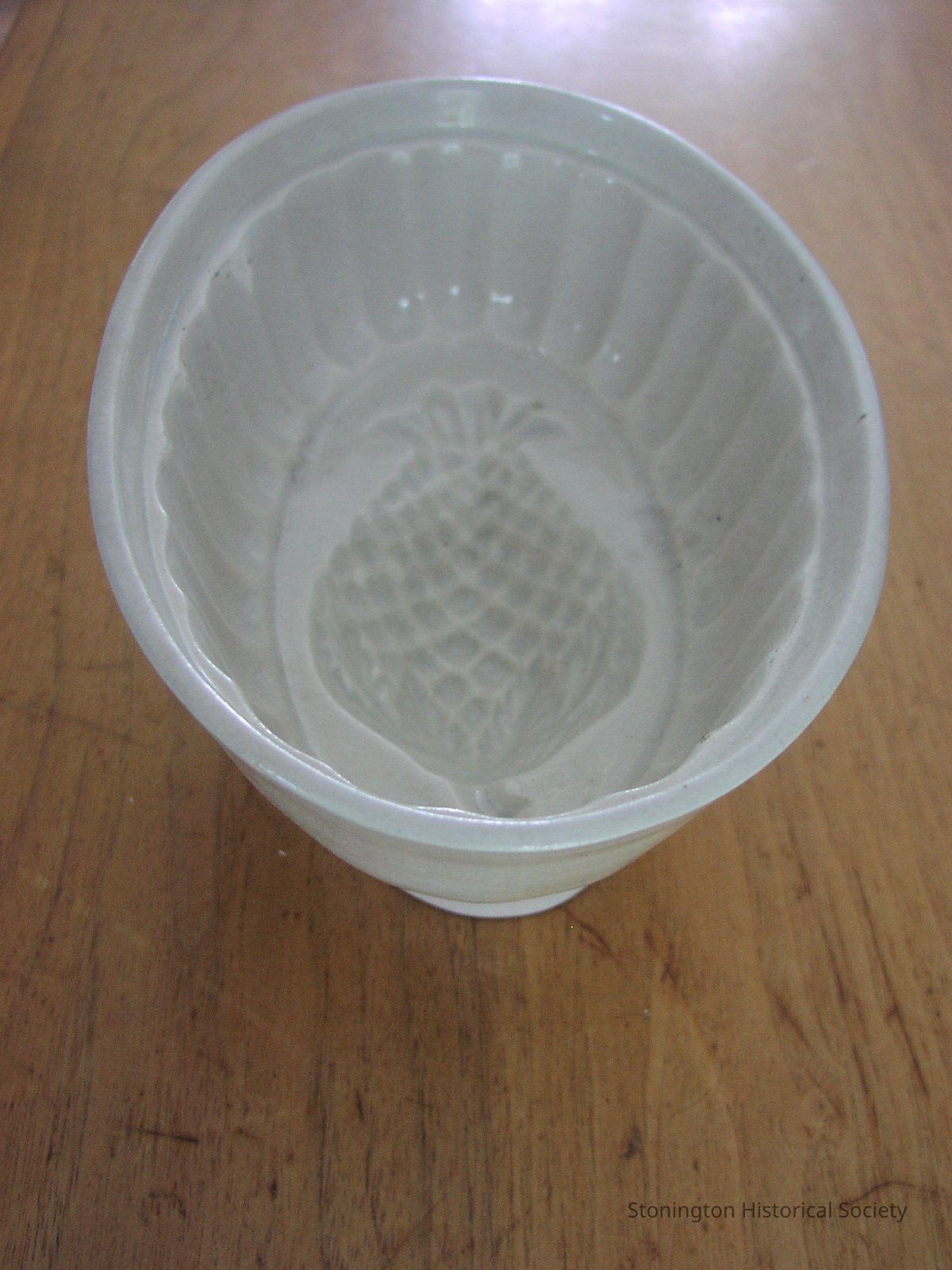 Stoneware oval pudding mold; white glaze, crackled with pineapple shape in bottom, concave columns on inside walls. Outside of mold is smooth.