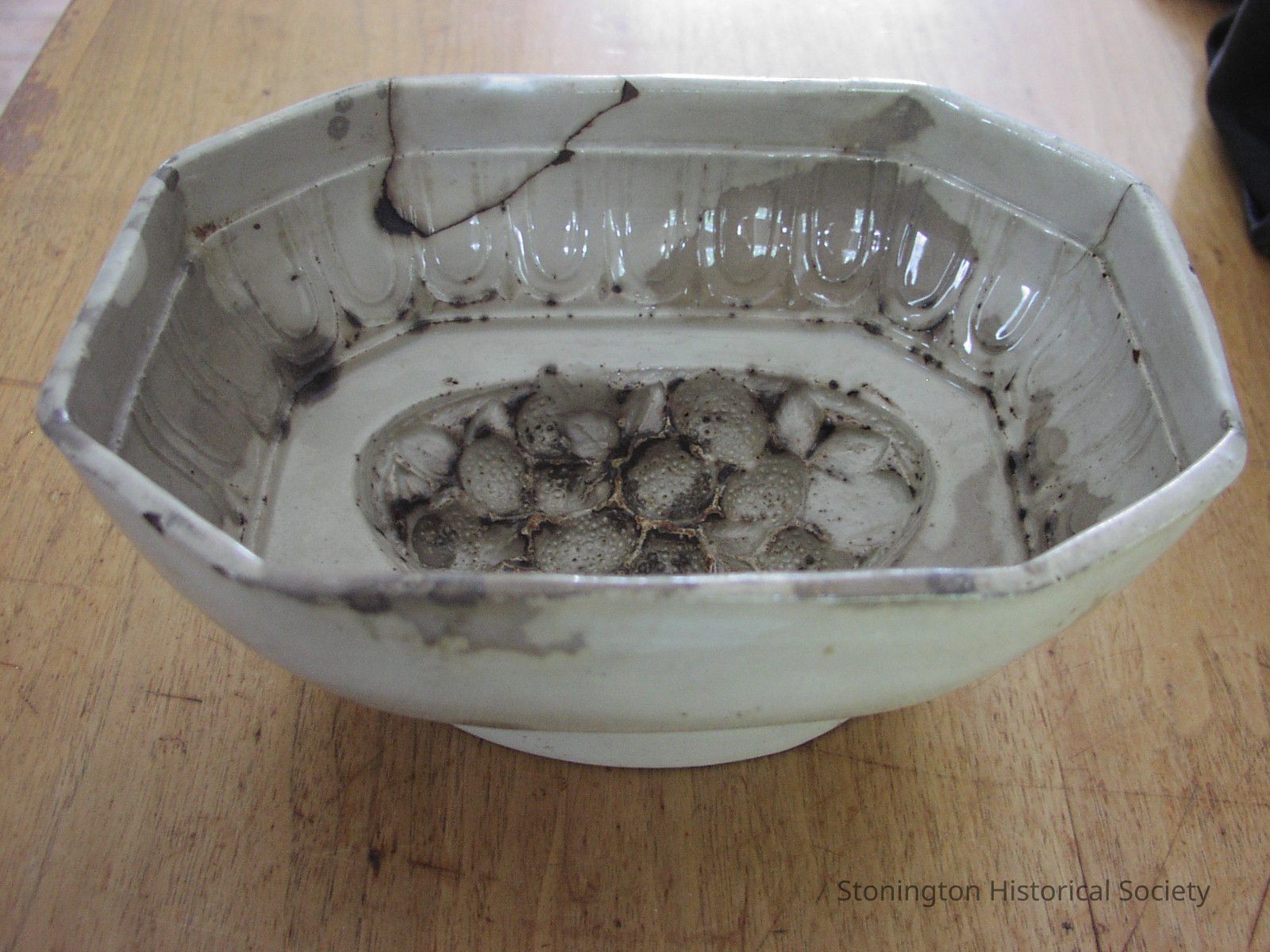 Stoneware octanonal mold, tan; stapled breakage; turreted sides with fruit basket shape in bottom. Outside is smooth. Imprinted on side "3 54"