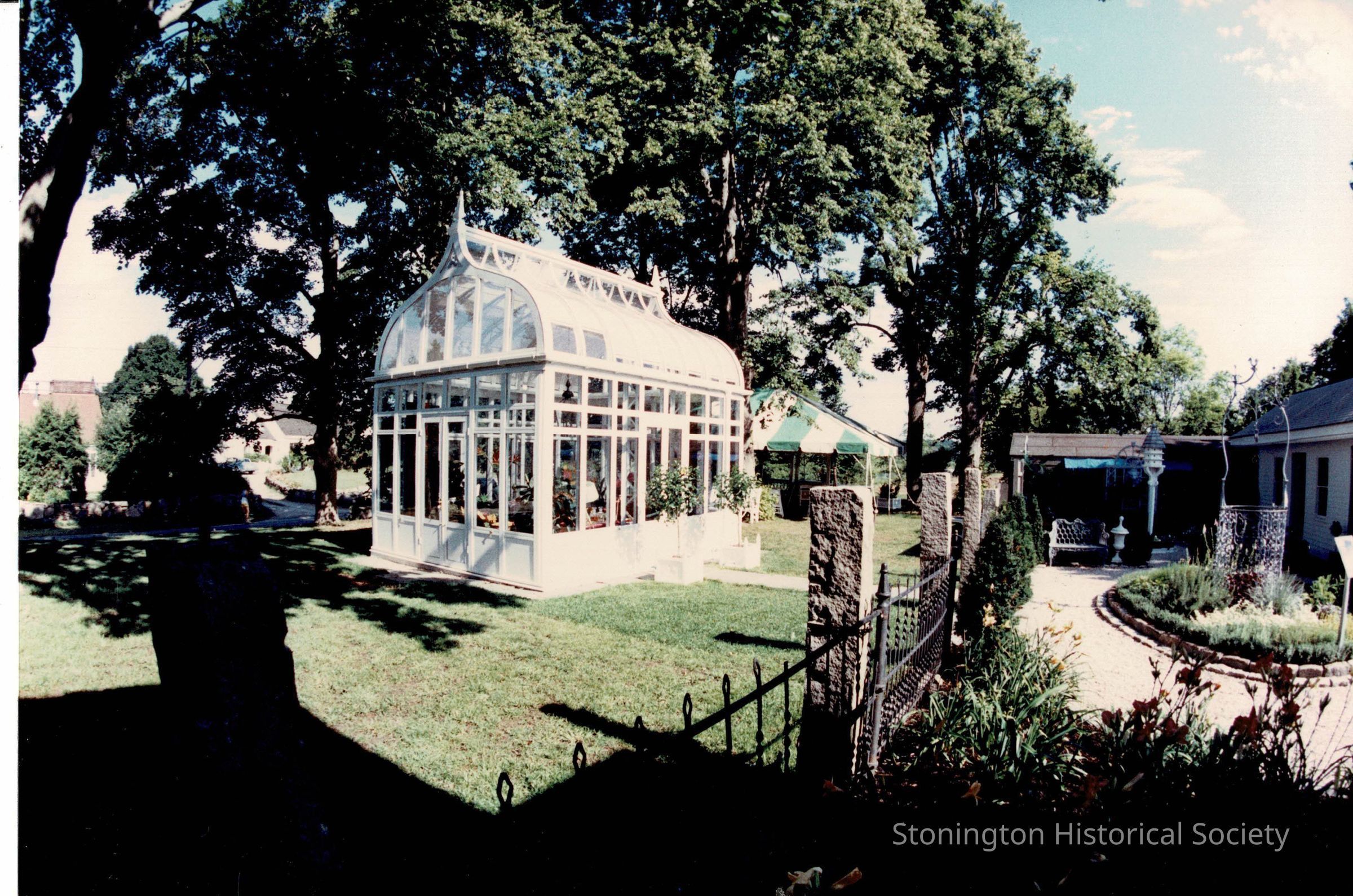 View of “A Summer Place”, as it was for the Designer’s Show House in 1989. A Summer Place was designed by Arnold Copper and William Strohm of Madison Avenue, NY. It was placed on the west side of the service yard, and removed after the Designer's Showhouse. This view was taken from the first floor of the Palmer House, and also shows a bit of the landscaping of the service yard, which at the time had been transformed into an herb garden.Collection