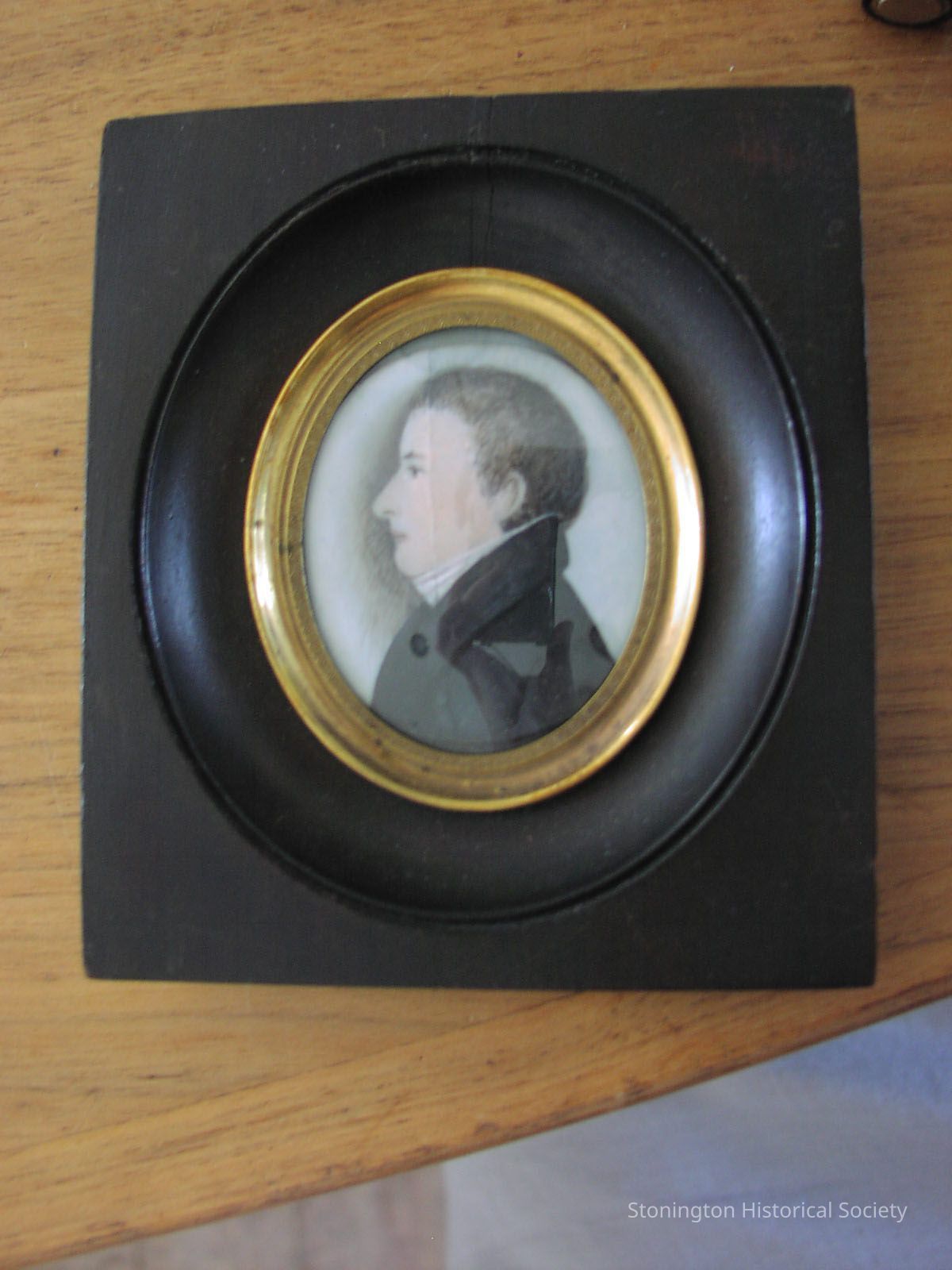 Miniature profile portrait on ivory of unidentified man facing viewer's left. Framed in rectangular, black wood with metalic gold oval inset. framed in gold oval. Back ground is grey fading to shadow around profile. Framed behind glass in rectangular black wood (laquer?) with metalic gold oval inset, 2-1/2 x 3"h. Frame, 4 x 4-1/2". Handwritten on verso "Portrayed at 40 years of age." C. 1835? One of pair with PH1989.179.002, female miniature, presumably his wife.Collection