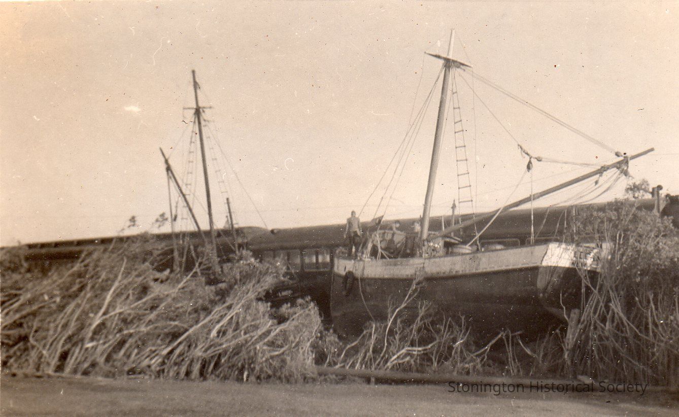 Black and white photograph of the boats washed up on the train tracks outside of Stonington Borough following the 1938 Hurricane, "Where Train & Boats Meet." From photograph album of Bertha D'Amico.