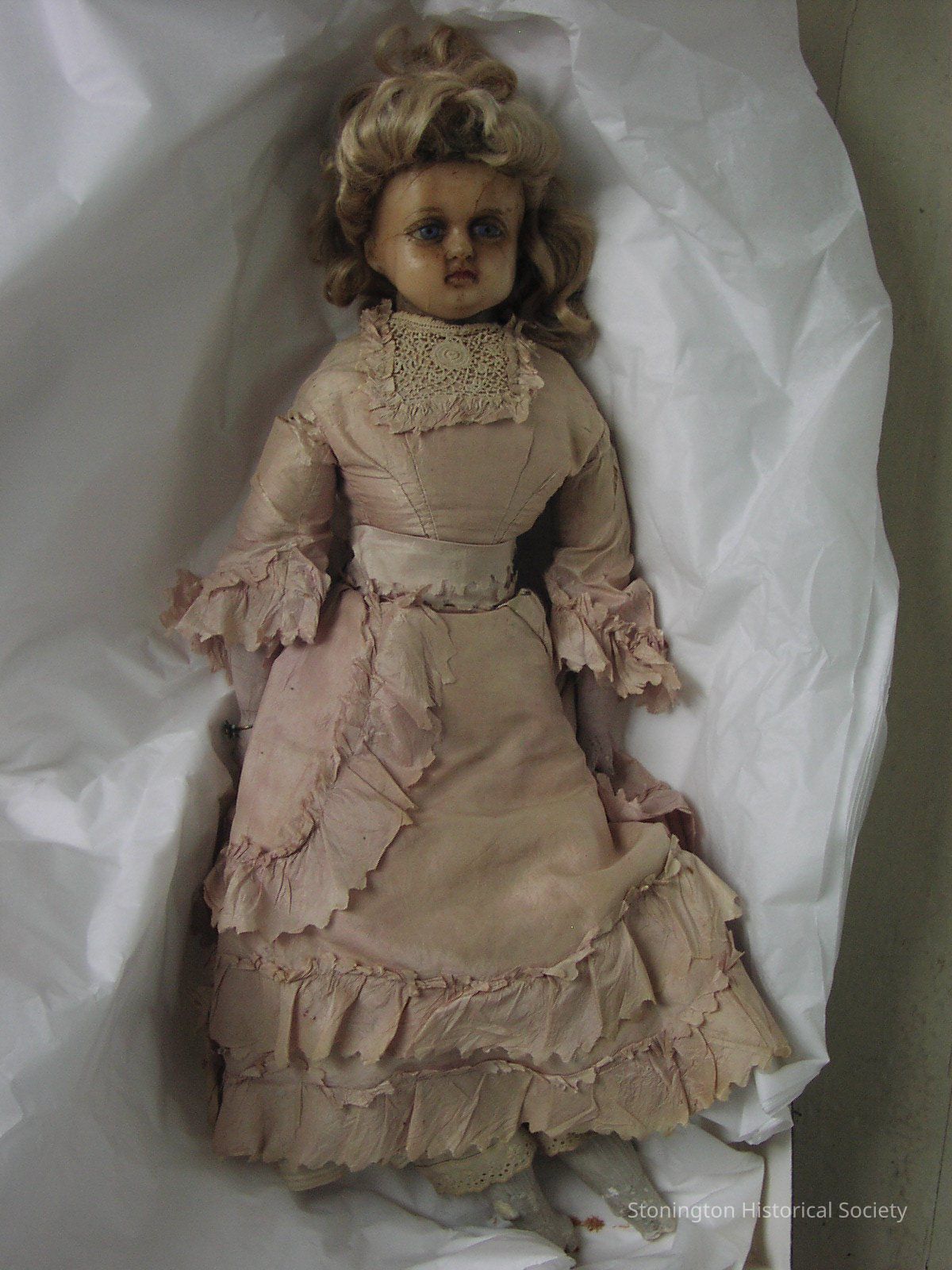 Wax doll with bisque boots and arms.