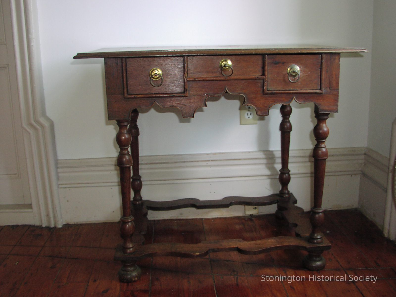 William & Mary style dressing table with tulip feet and curved foot rail; ogee shaped apron and 3 small drawers in front. Walnut or mahogany? c. 1700. Also called a Lowboy.