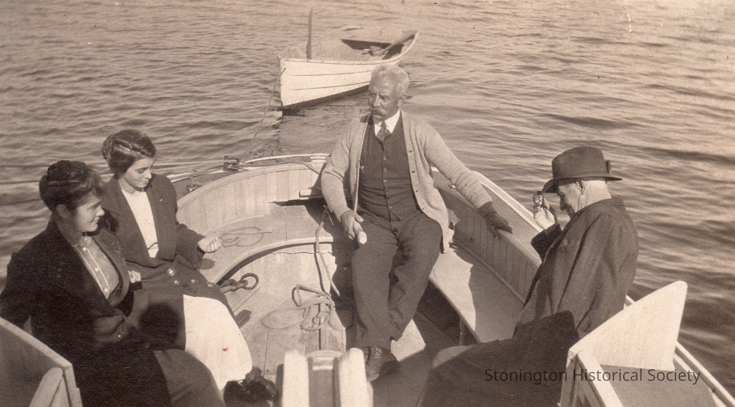 Photograph from the Harry Northup album (2015.019.002), black and white snapshot with enlarged print. Caption from Harry Northrup: "This is a photo of my grandfather, Edwin Northrup, at the tiller of the LOUISA. His guests were Mr. Wells on the Port side and his wife and daughter on the Starboard side. The daughter, Geneva, was my father's girlfriend at the time."Collection