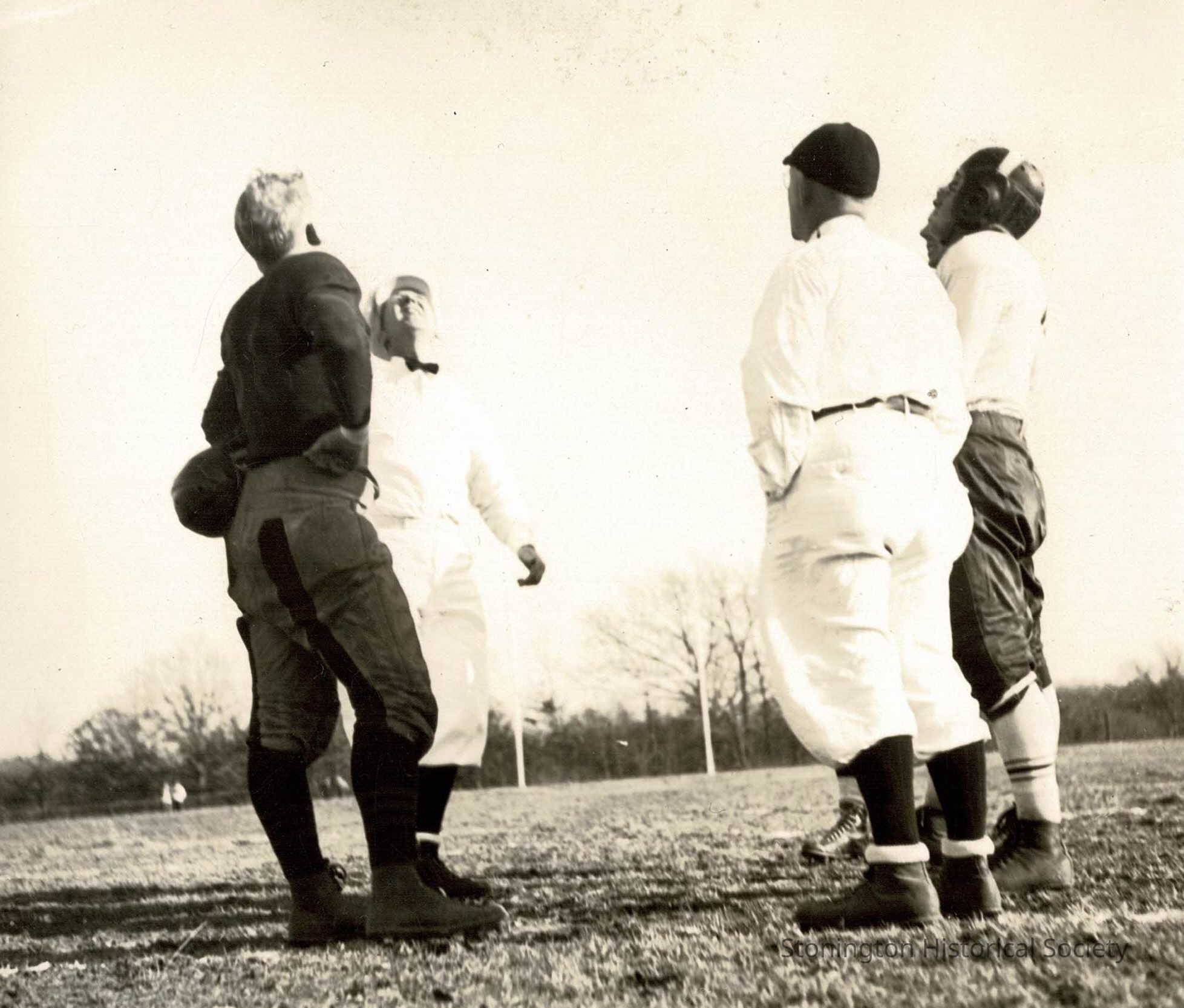 Black and white photograph showing two referees and three student athletes watching the coin toss at a football game, c. 1930s.Collection