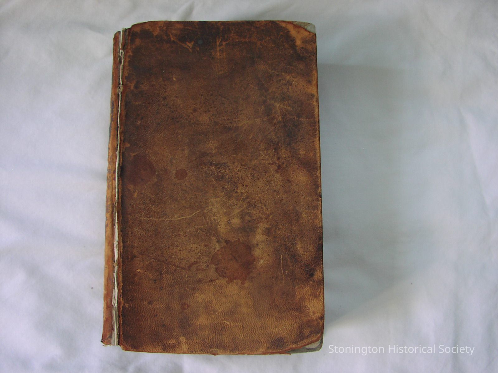 Book: "Dictionary of the English Language", Samuel Johnson, 1805. The cover is an orangey-brown color. It is crumbling from age, but the pages of the book are well preserved.