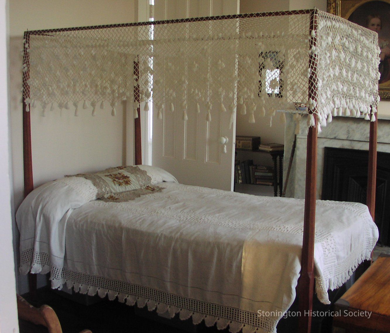 Wood, pencil post, 3/4 bed, late 18th century, rope spring, original red paint, from Stonington house, modern netted canopy, straw-filled mattress, striped ticking, made by Ellen Anthony.Collection