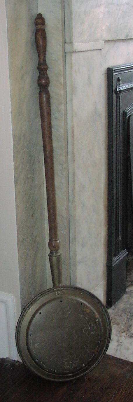 Brass bed warmer, 12" diameter, flowered pattern on lid, 41" turned handle.