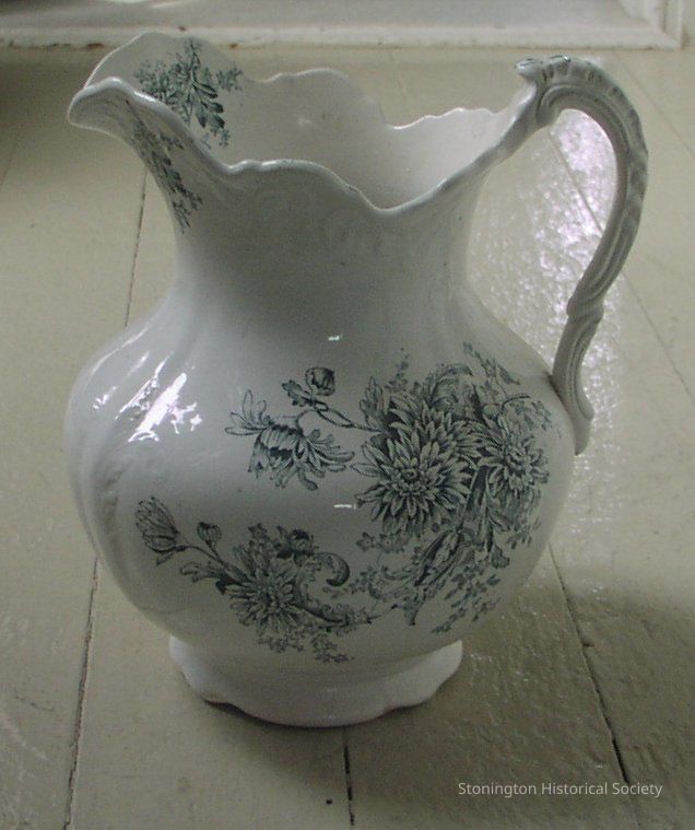 Blue Staffordshire china pitcher with a landscape scene. The scene features the ruins of a building (a church? monastary? Castle?) set against a mountainous environment. A floral design covers the area around the rim whilst a pattern of geometric diamonds decorates the handle.Collection