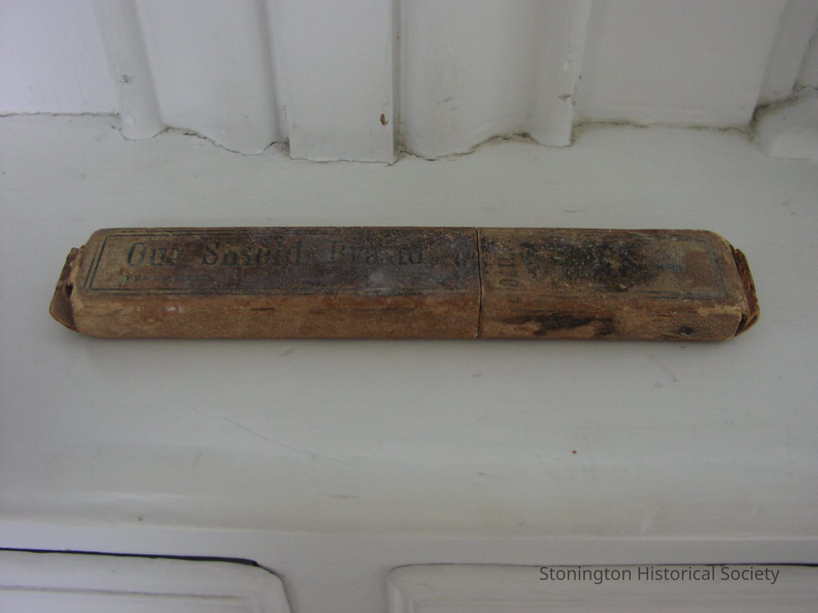 "Our Shield Brand" Brown box for razor, shorter piece slides off end, green embossed printing