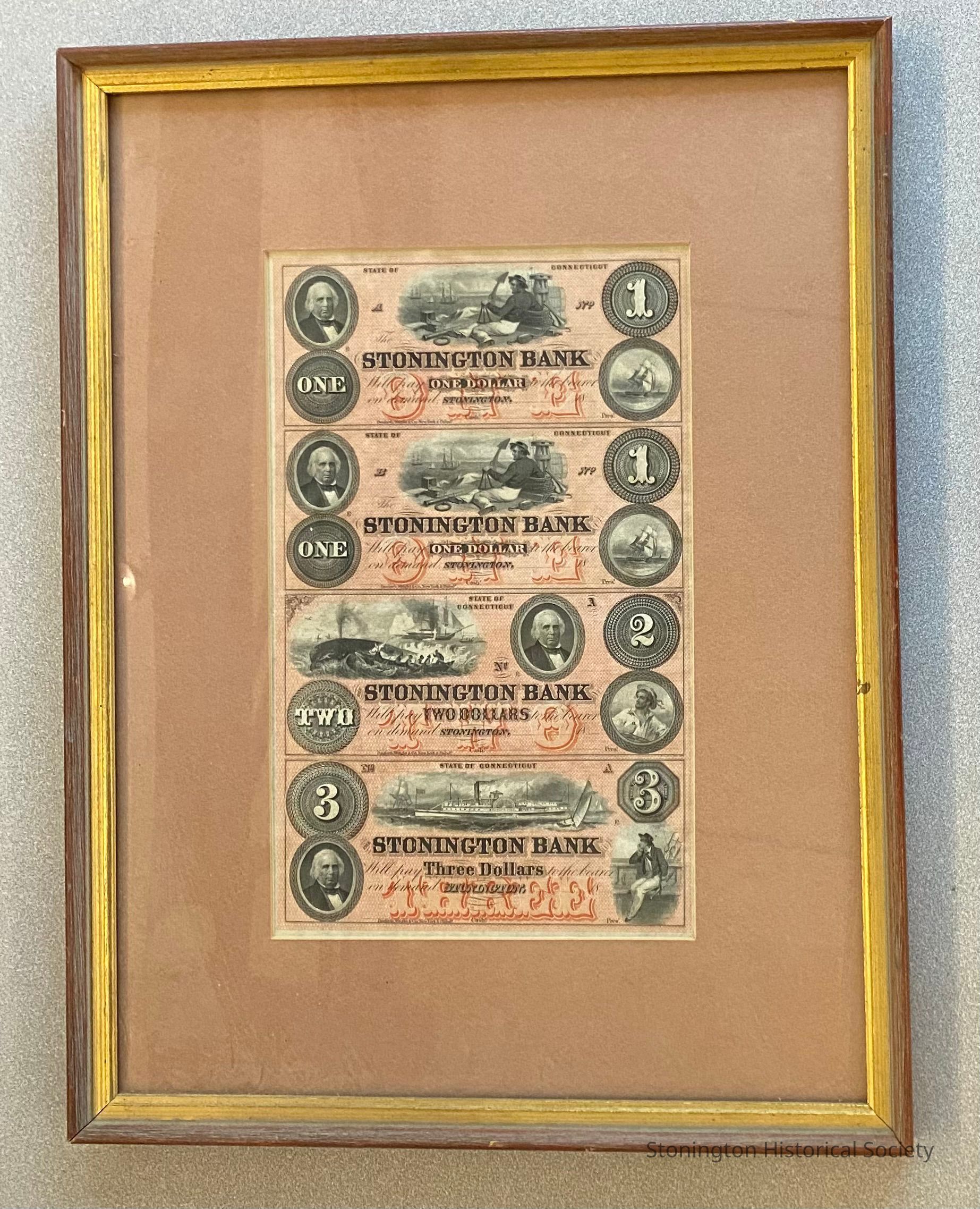 Framed series of 1$, 2$ and 3$ bank notes from the Stonington Bank.