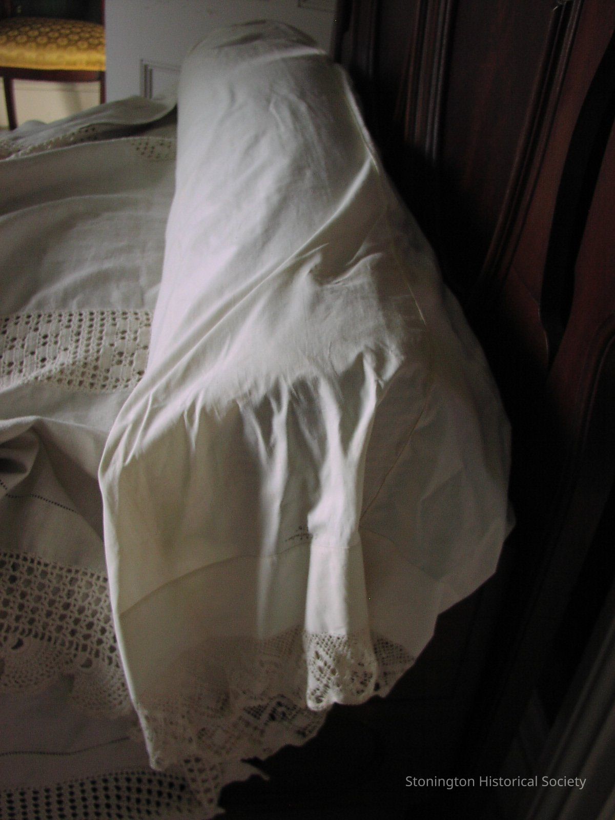 Cotton pillowcase, fine white, handmade bobbin lace border, "C. E. Johnson.6:78" marker