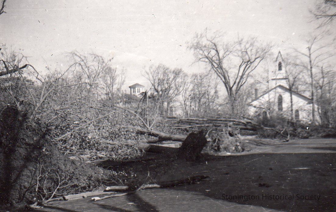 Black and white photograph of damage from the 1938 Hurricane at Wadawanuck Square. From photograph album of Bertha D'Amico.