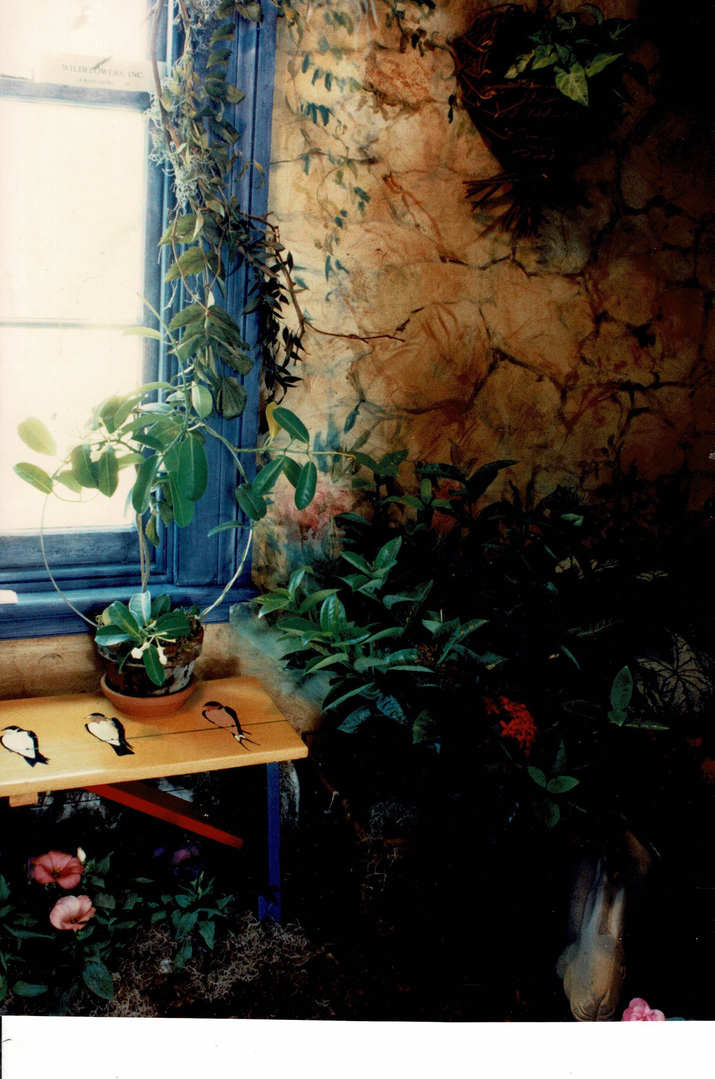 A view of the "Secret Garden" as it was decorated for the Designer's Show House in 1989. This room is off of the Palmer House laundry, (2024 kitchen) and is now a bathroom. Interior design done by Wildflowers, Inc of Old Saybrook, CT. Trompe l’oeil mural – Judith Cheng; painted furniture – Teka Schtatz; Florals & botanicals – Kathleen MacDonaldCollection
