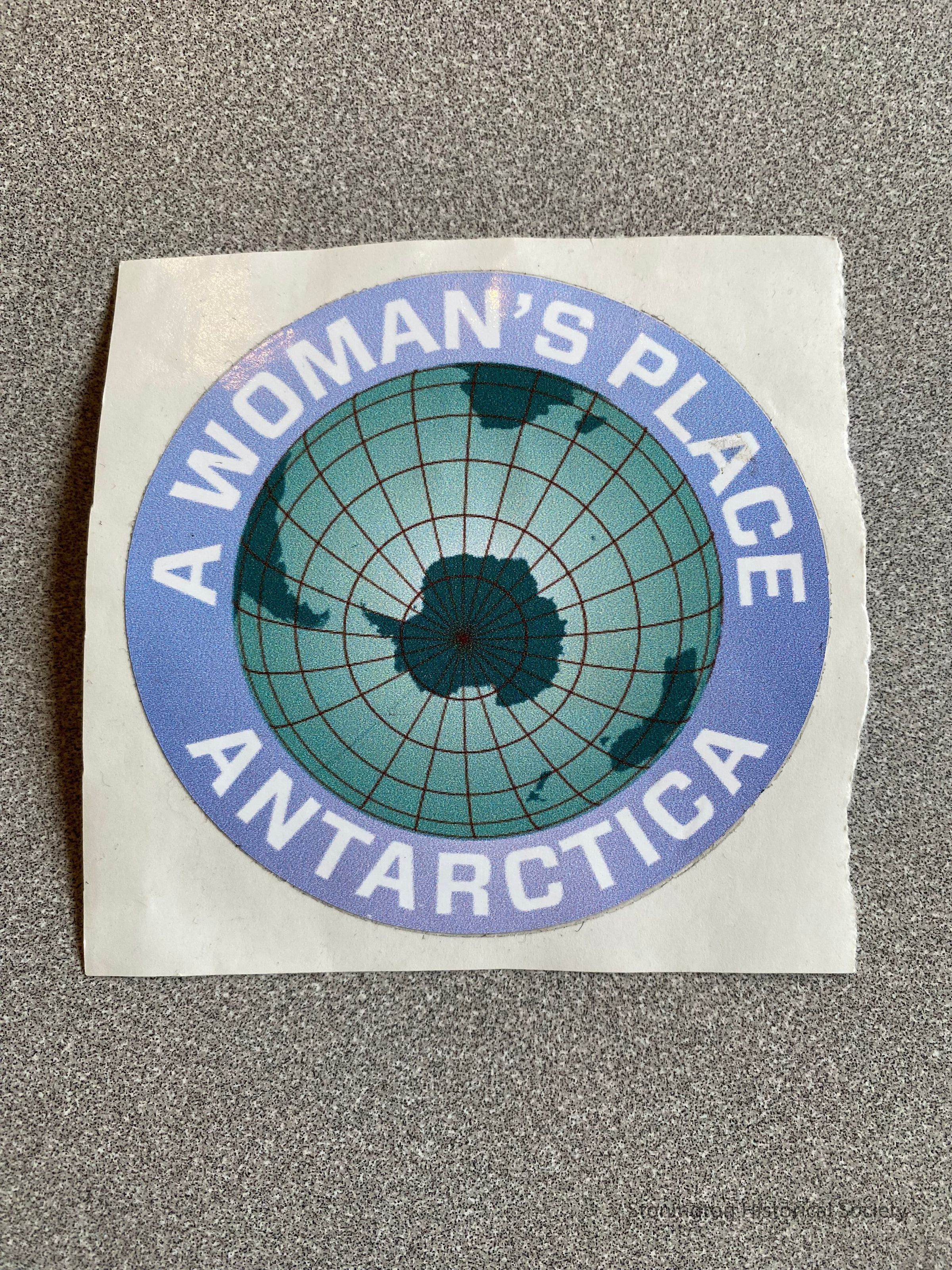 Blue and green bumper sticker from Antarctica that reads: "A woman's place" "Antarctica". In the late 1980s and into the 1990s, women were making progress in Antarctic research and field work, but still faced many challenges. The first all-female overwinter group was in 1990. In 1993, Ann Bancroft and Liv Arnesen led the first all-female expedition to the South Pole. Many women faced sexual harrassment, gender bias, physical and logistical challenges (availability of correct clothing sizes, navigating caring responsibilities), and a lack of support or sympathy for the needs of mothers. This bumper sticker was created at a time when women were becoming more involved and recognized in Antarctic research.Collection