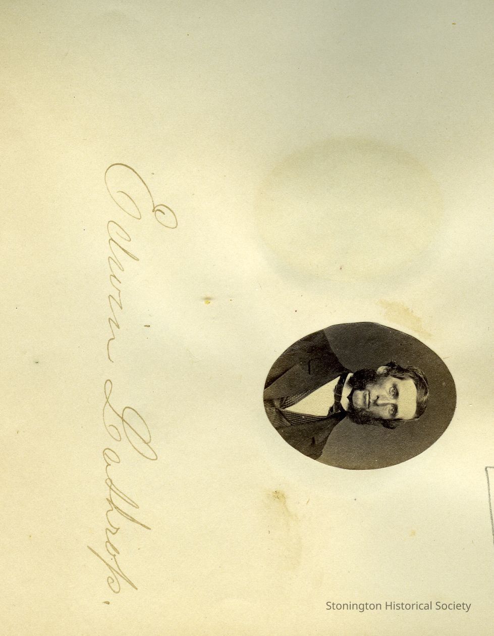 Small oval portrait of Edwin Lathrop in "Photographs and Autographs" book