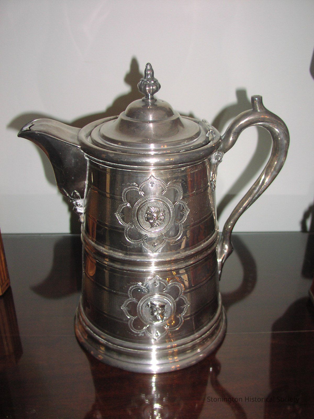 Silver pitcher with attached lid. Engraved below spout inside wreath "Pendleton". Decorated with four medallions with profiles: two upper of women and two lower of men.Collection