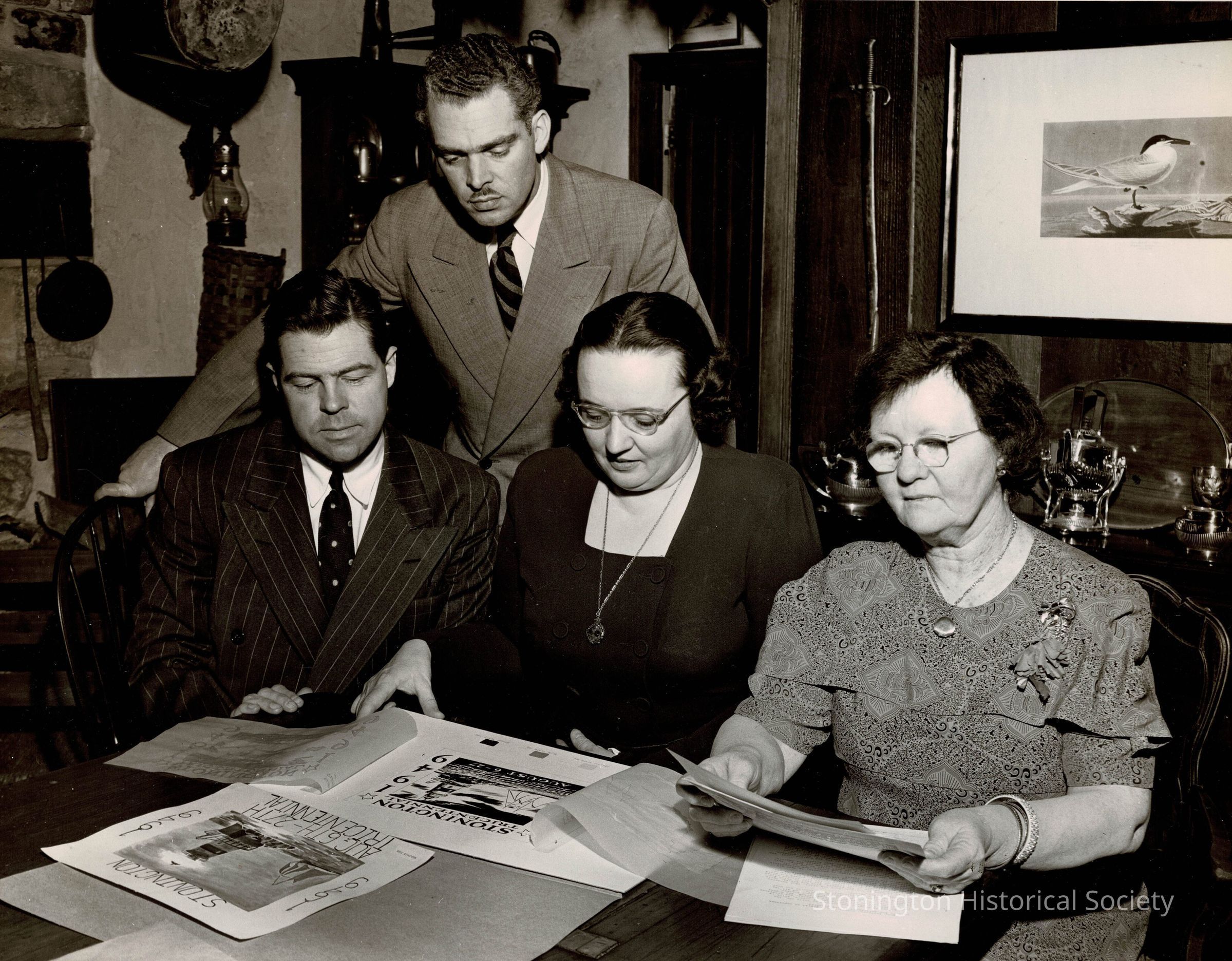 Black and white photograph taken by Frank Jo Raymond showing members of the Executive Committee for the Stonington Tricentennial in 1949. Standing in the rear is Stanton Saunders, Program Co-ordinator. Sitting, left to right are William C. Petty, Mrs. Hobart Siswick, and Mrs. Katherine B. Crandall.Collection