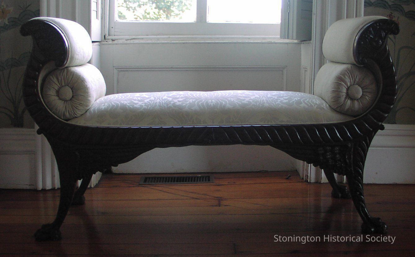 Rococo-revival style upholstered bench with winged griffen legs and feet, pillows tucked under arm rests, floral carving on front of arm rests, upholstered in faded mint green damask.Collection
