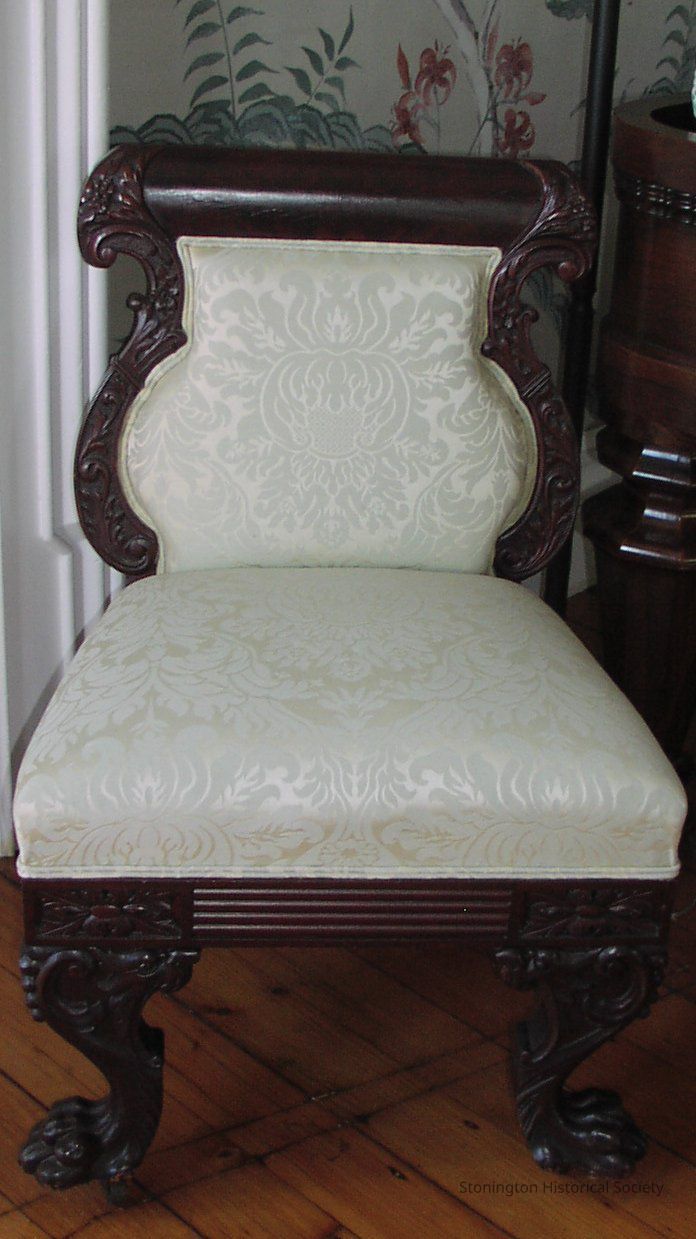 Upolstered side chair in rococo-revival style; faded mint green upholstery with griffin carving head to feet on front legs, feet on wheels.Collection