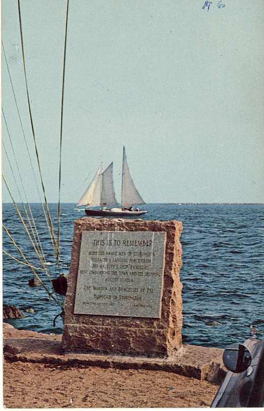 note included with postcard: Marker at Ston. Pt. commemorating the brave defenders who repulsed the British in the War of 1814. Note schooner yacht in background - surely this was planned.