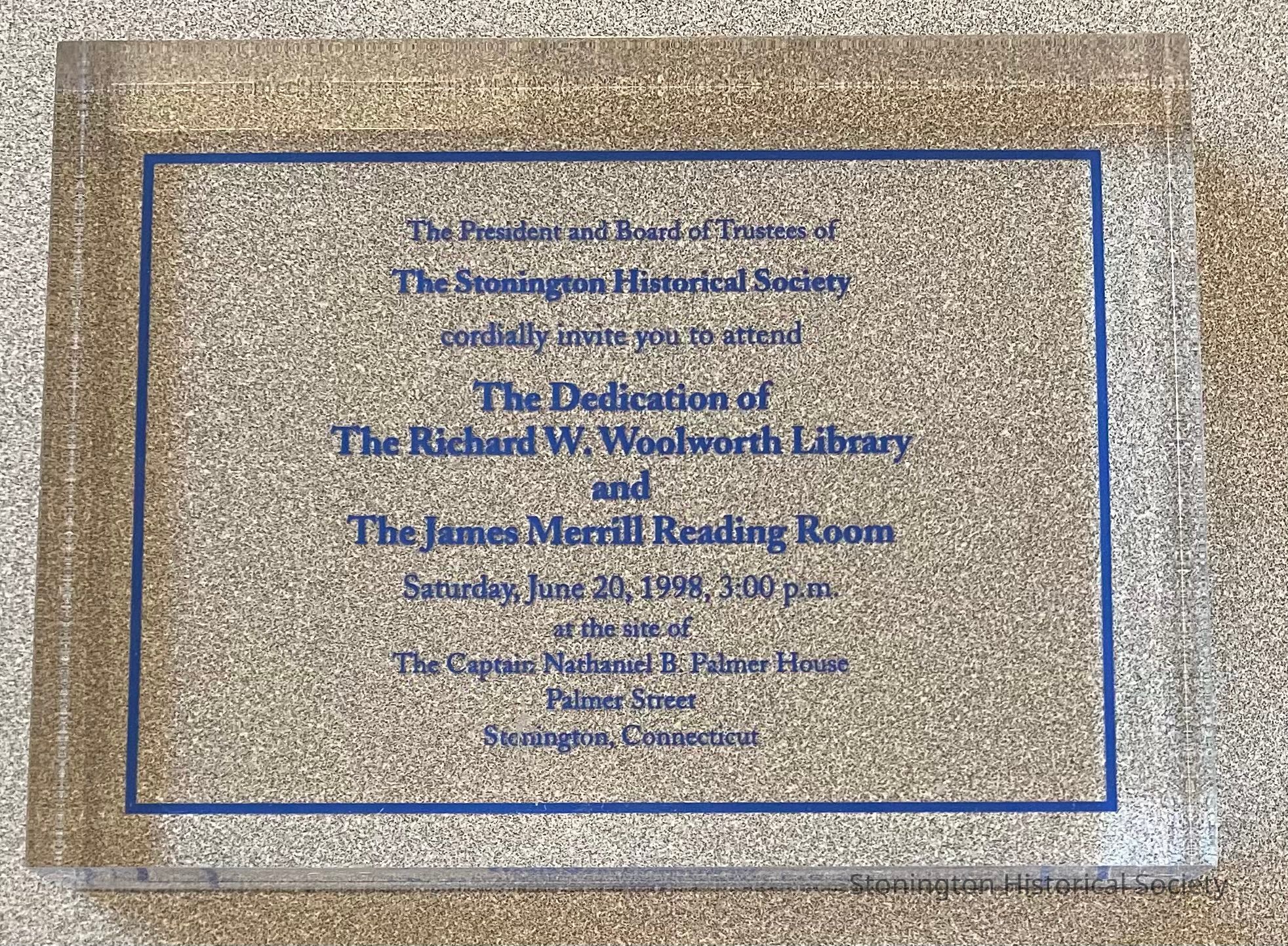 Clear plastic paperweight invitation to the Dedication of the Richard W. Woolworth Library and James Merrill Reading Room, June 20, 1998.