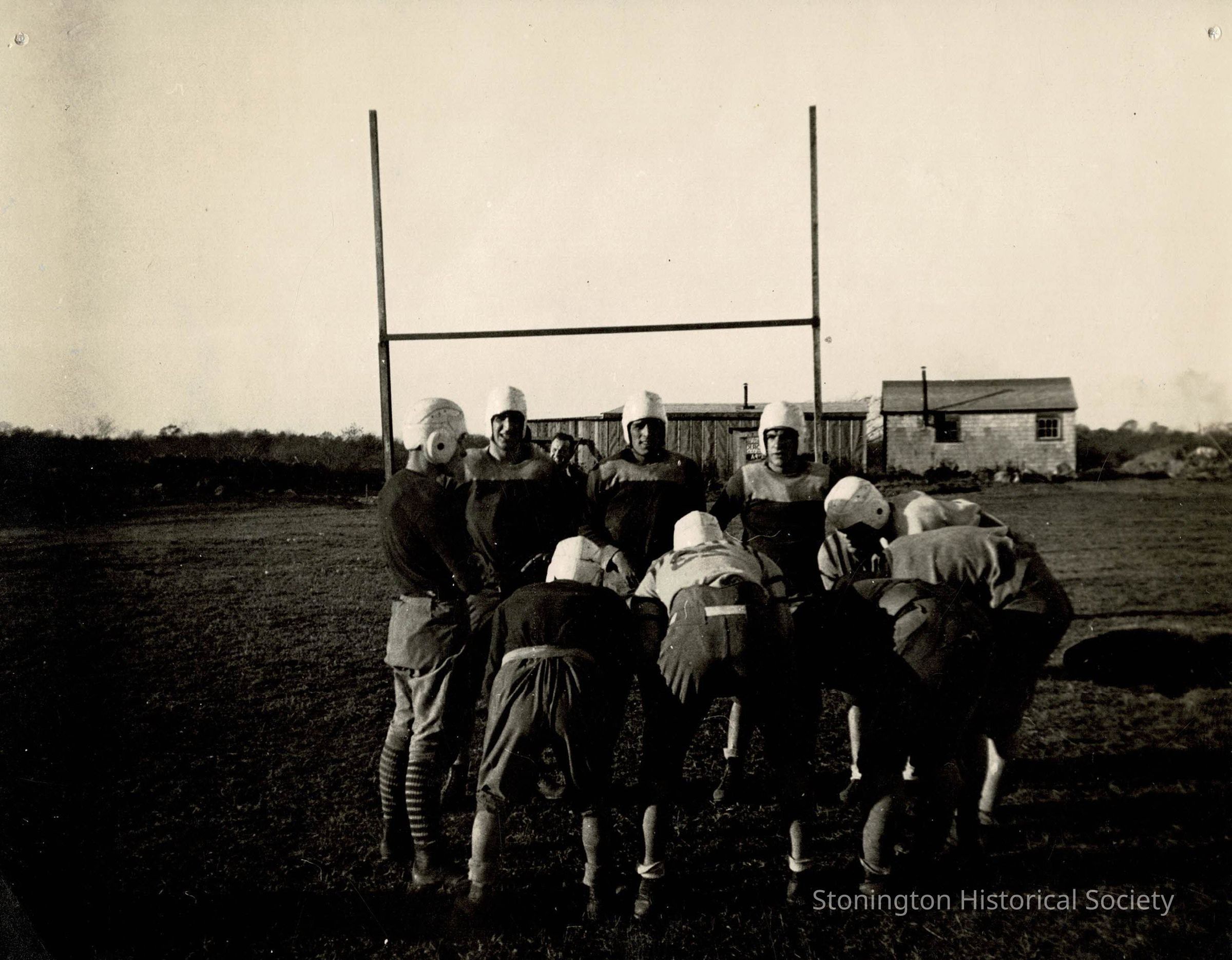Black and white photograph showing the Stonington High School football team, in the fall of 1936, on the playing fields behind the modern-day High School. Members of this year's Varsity team include: Lenard Reid, Robert Brannegan, Charles Rippel, John Gatchek, Seneca Allyn, Anthony Campo, James Spellman, Robert Holly, Ernest Cravinho, David Austin, George Oak and James Emilio.Collection