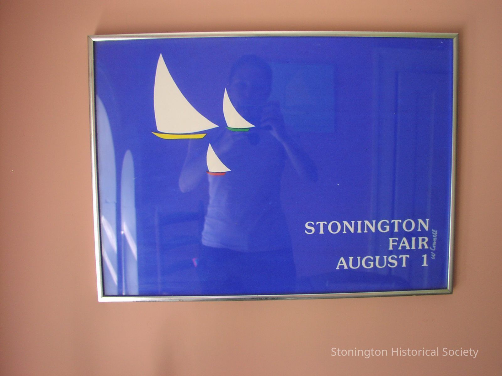 Stonington Village Fair poster, August 1 (1981) framed. Bright blue with three sailboarts; signed on right edge, vertically. One of 18.Collection