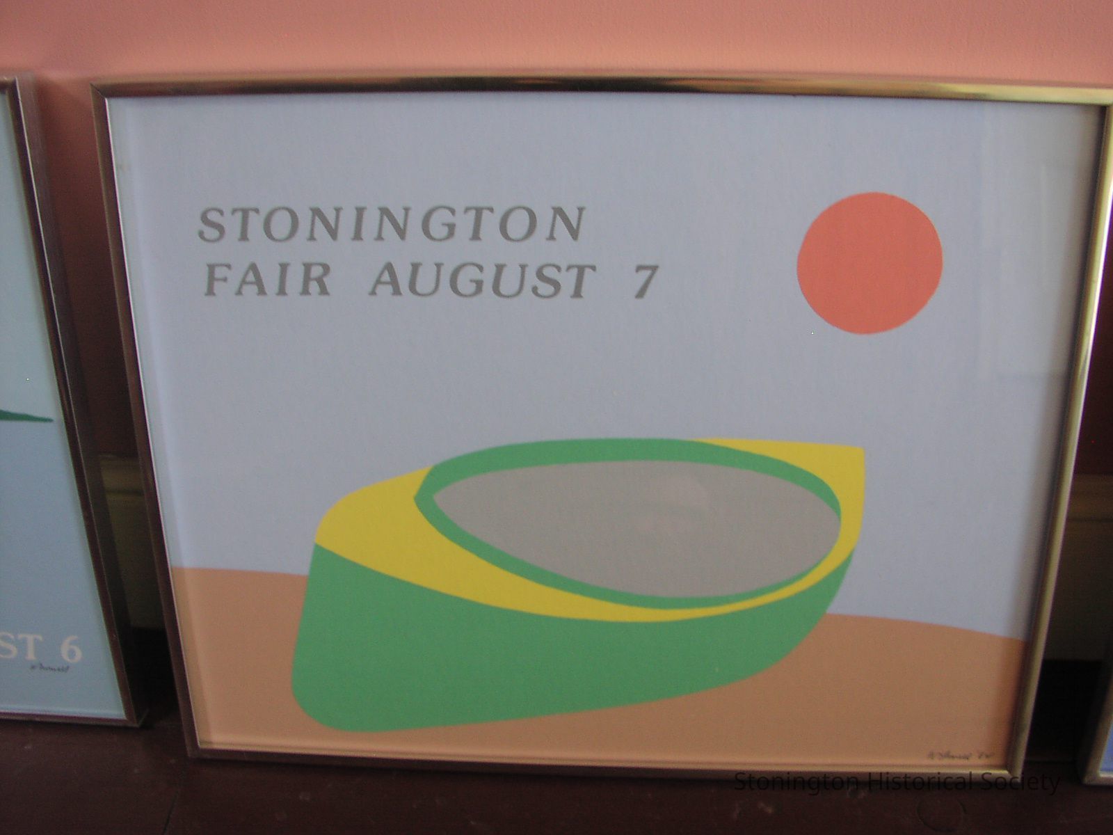 Stonington Village Fair poster, August 7 (1982), framed. Blue, green, brown, yellow, orange; row boat on beach with sun. Signed and dated at lower right. One of 18.Collection