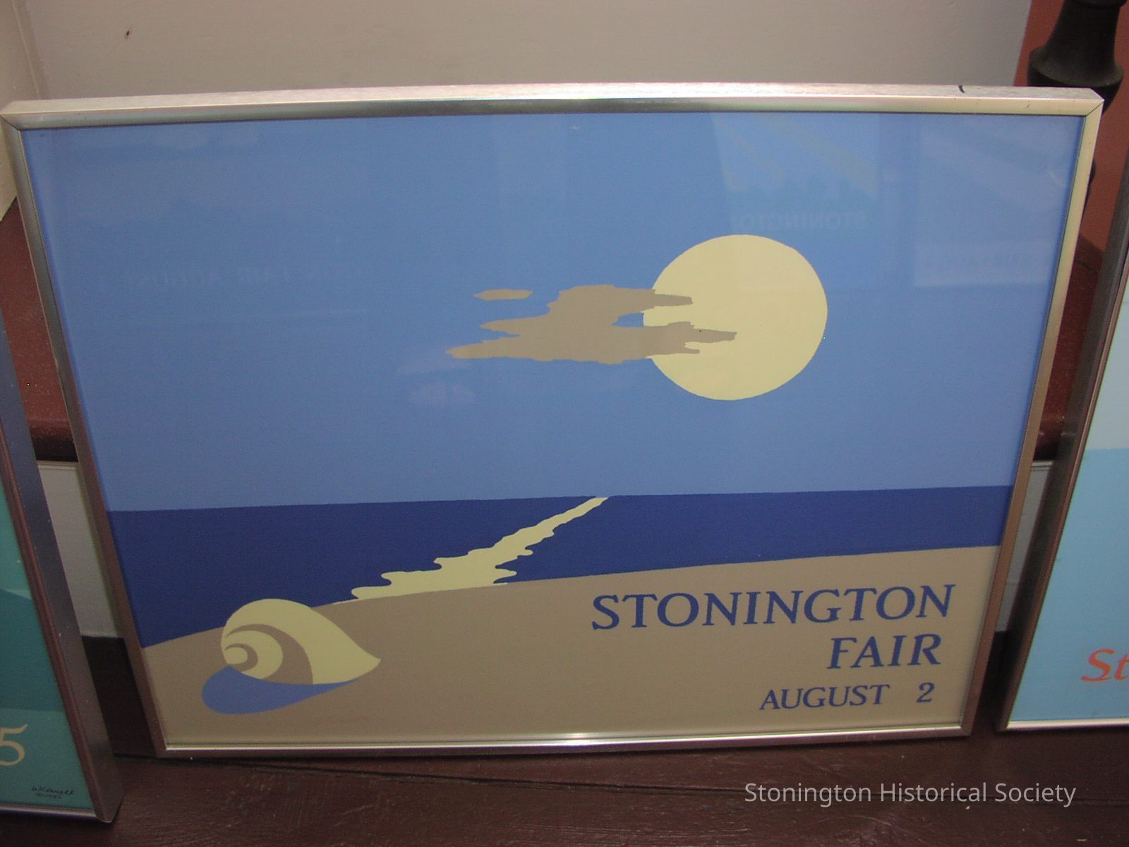 Stonington Village Fair poster, August 2 (1986), framed. Light blue, blue,tan and yellow: beach with shell and sun. Signed lower left. One of 18.Collection