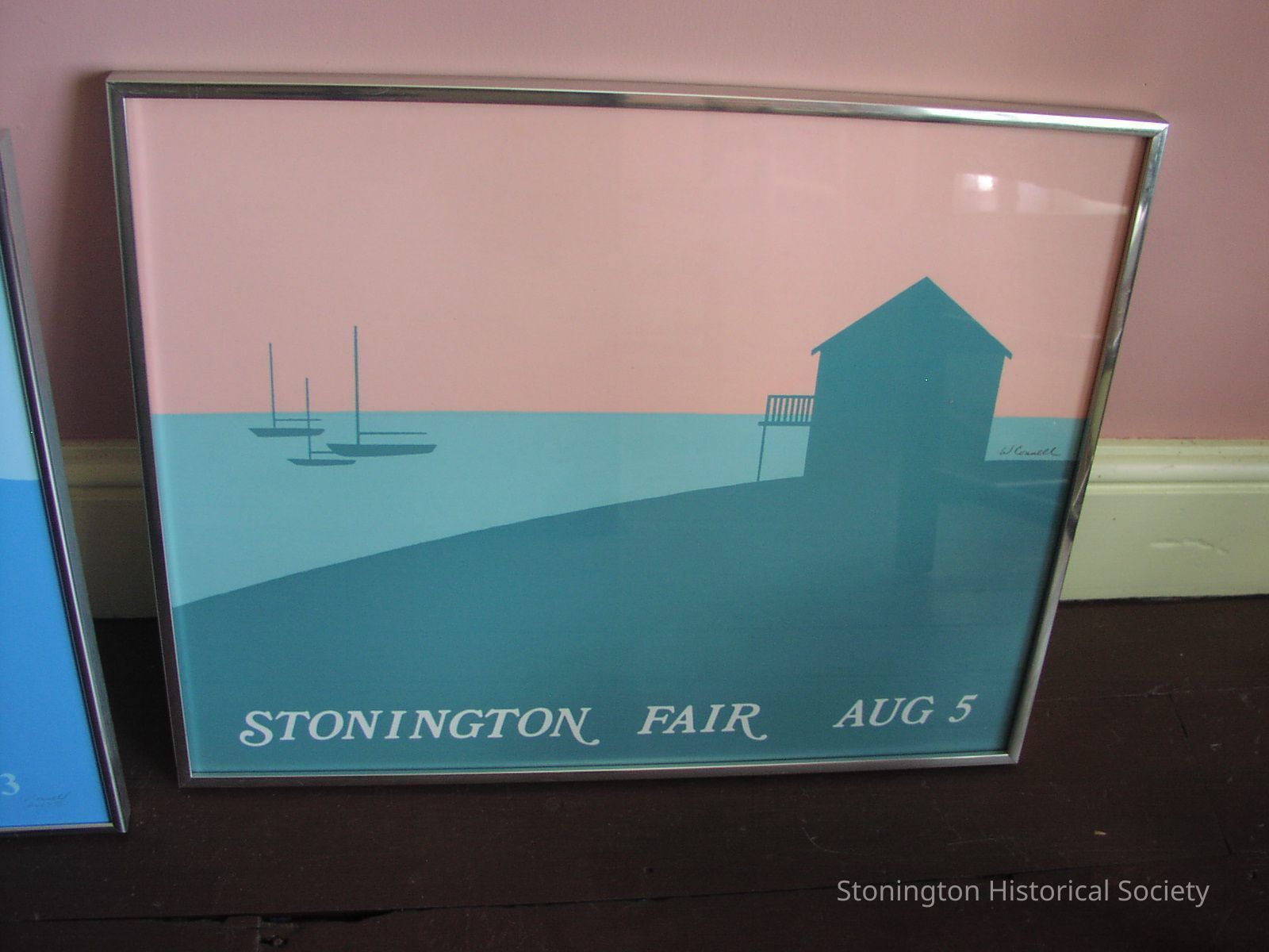 Stonington Village Fair poster, August 5 (1989), framed. Teal, light teal, pink; house with deck, three sailboats. Signed middle of right edge. One of 18.Collection