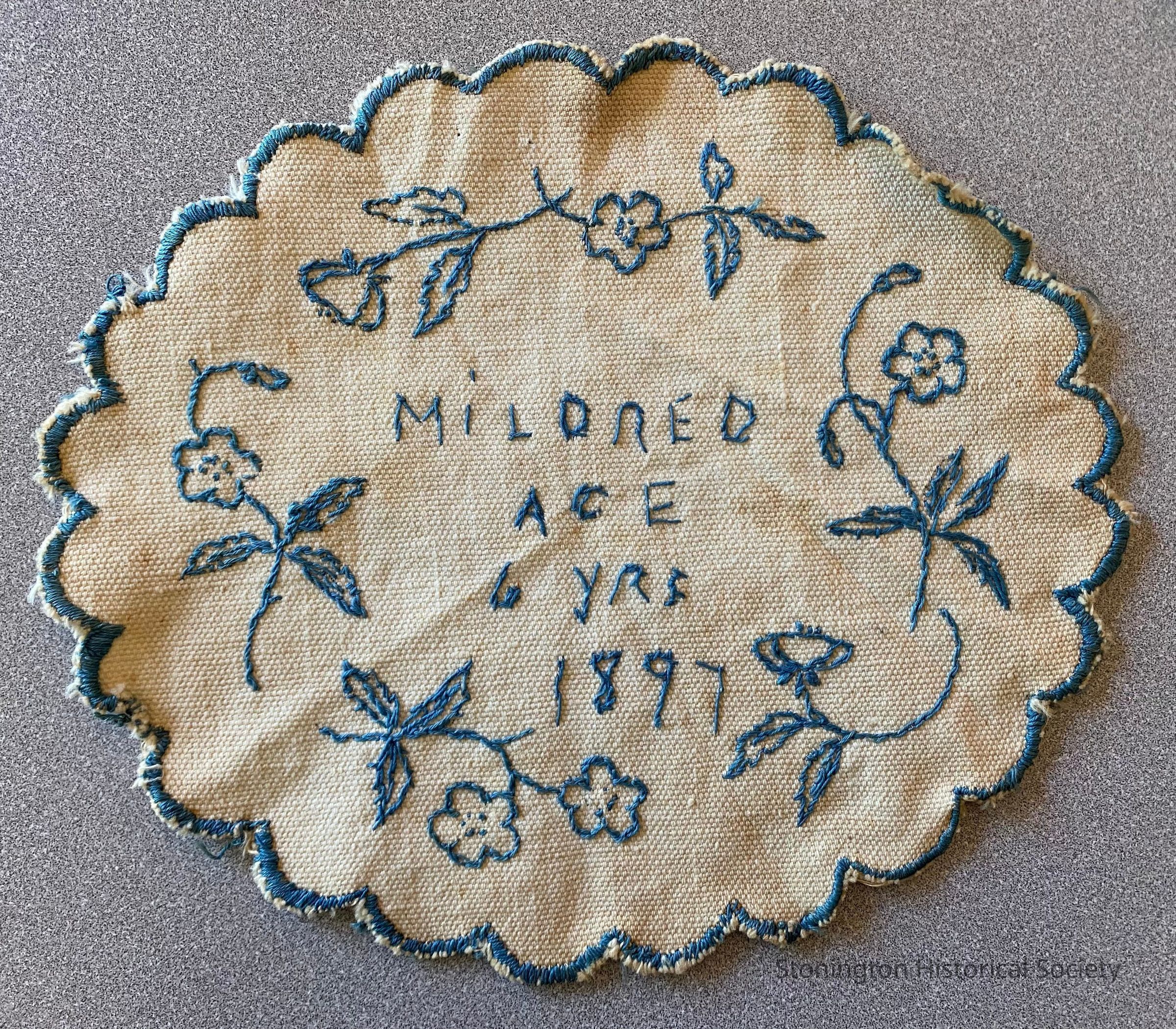 Piece of embroidery, oval shaped white cloth with blue thread, scalloped edge, "Mildred, age, 6 yrs, 1897" with floral embellishments