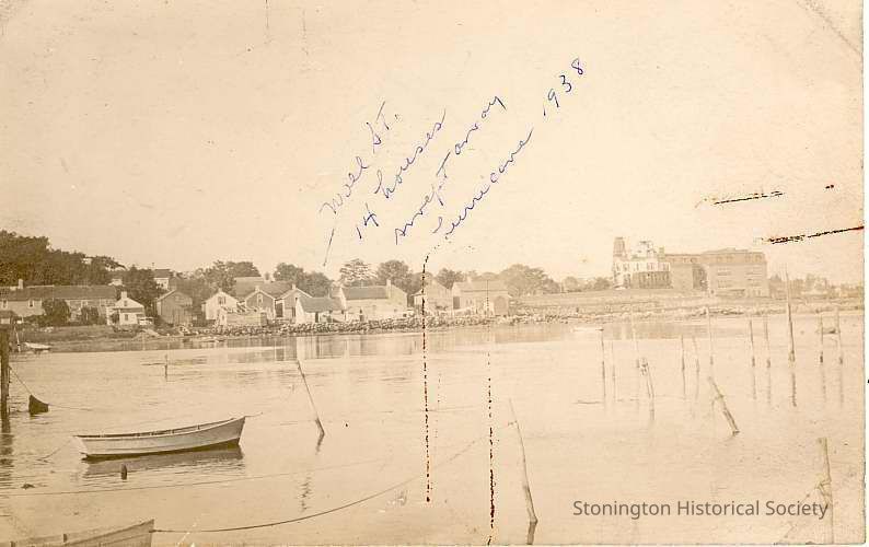 Notes on front, back and slip of paper: Wall St. 14 houses swept away hurrican 1938; Showing Wall St. where 14 houses swept away by 2 tidal waves (I saw them from my home the Anchorage) 1938 hurricane, extreme right Boro School and home of Eugene Atwood of At. Mach. Co.; View looking No. from the Bay showing 14 houses on Wall St. (Shinbone Alley) which were swept away in Hurricane of 1938 with loss of lives - SHS [boro school] in background.