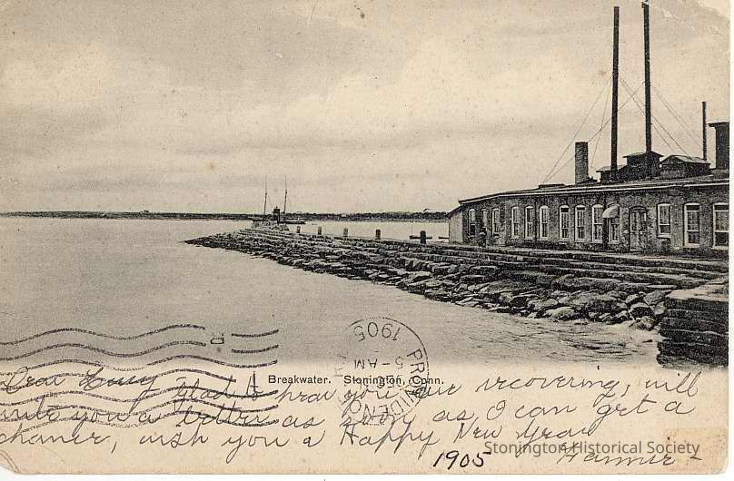 Postcard of Atwood Breakwater, Stonington CT. Sent to Mrs. Wilcox, Providence RI 1905