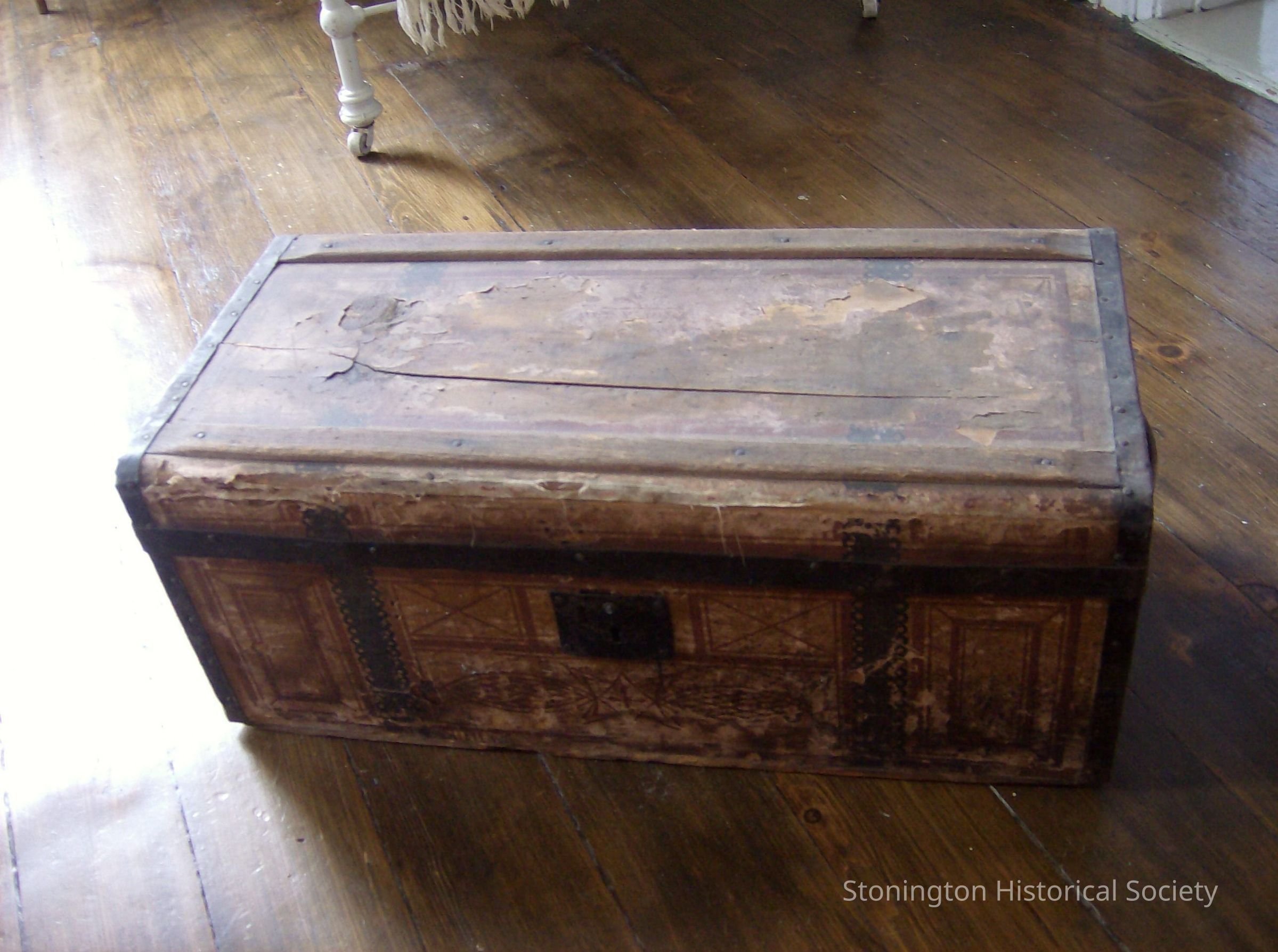 Wood box, metal trim around edges, lid corners, and bottom edge of lid