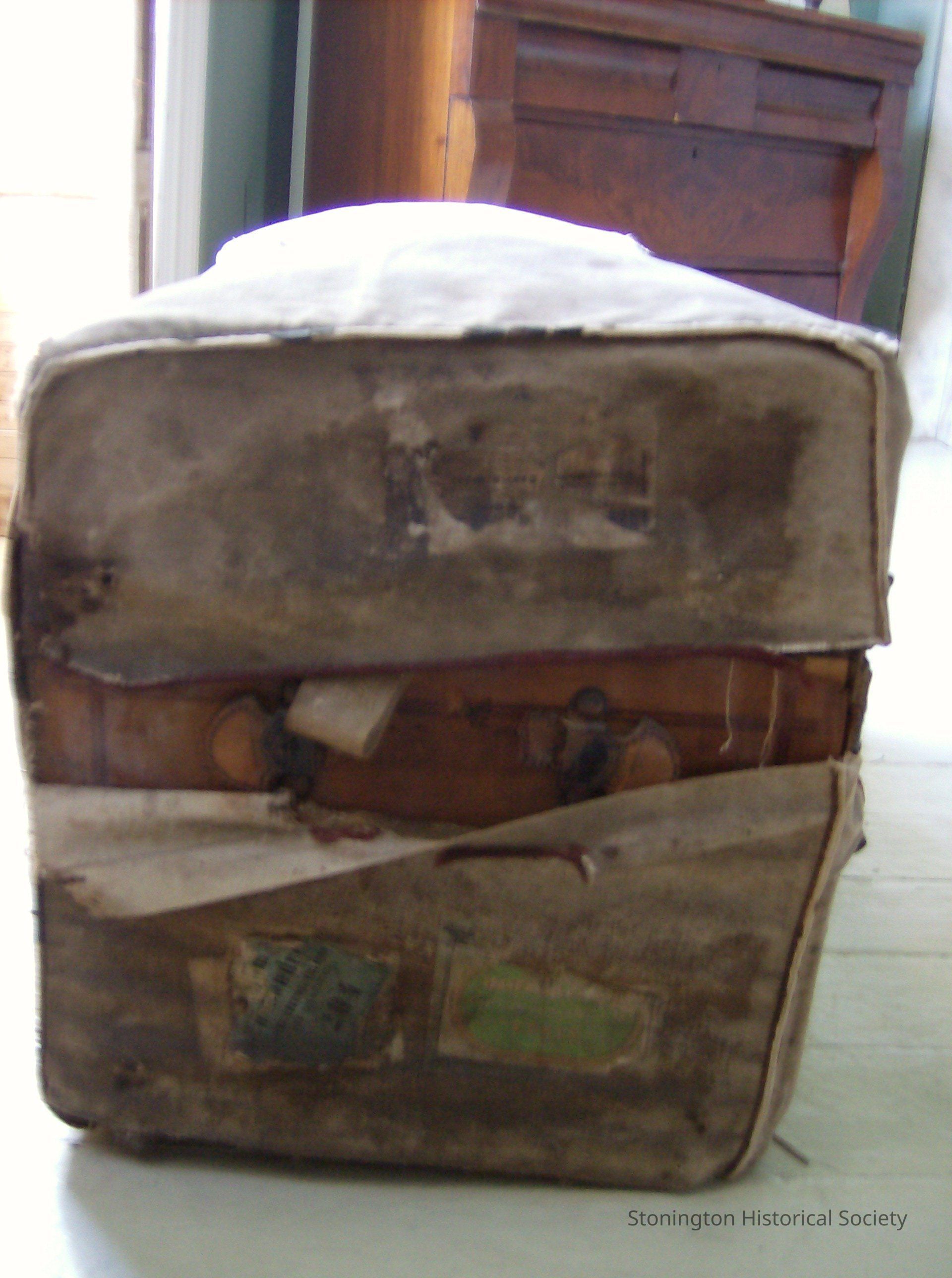 Baggage tags on each side- "Stonington Providence Baggage Express" (?), "New York Travel Company on Broadway" (?)