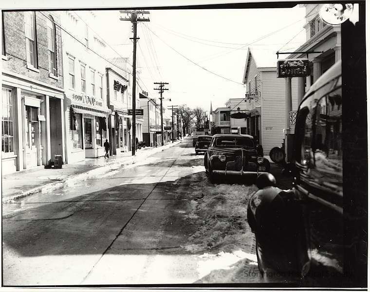Water Street south of Pearl Street, c. 1950 in winter with cars parked on right facing both ways