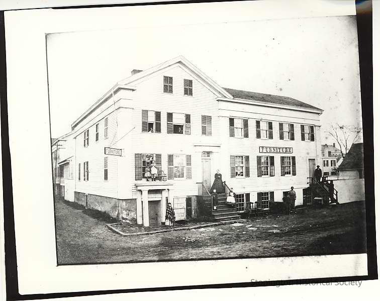 15 Gold Street; family home and store; Mueller Furniture Store. Later photo of previous one; people are standing on steps and street; covered porch on second floor has been removed and columns on corner; center steps now face street whereas before they were parrallel to street