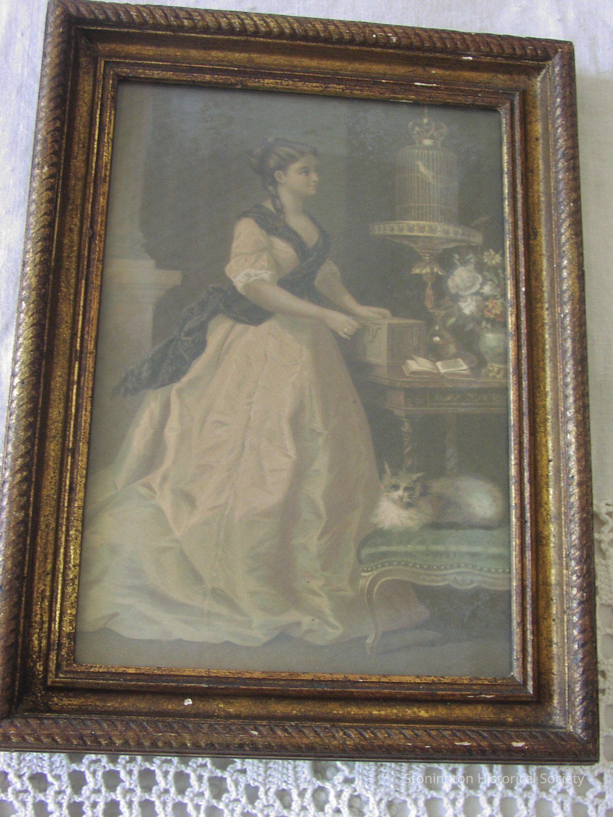 Framed color lithograph on canvas, one of set (PH1998.003.01). Depicts woman in pink satin gown looking at canary in cage while a cat sits below.