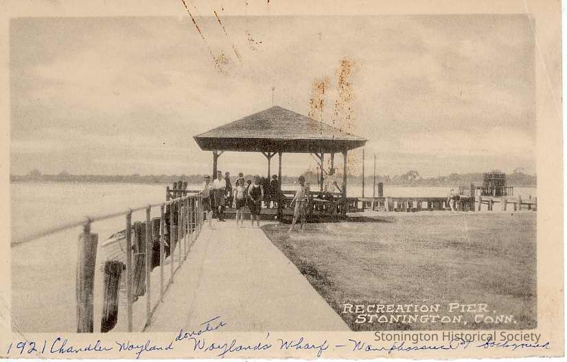Photo of Recreation Pier, Stonington CT with note indicating it is Wayland's Wharf with Wamphassuc Point in backround