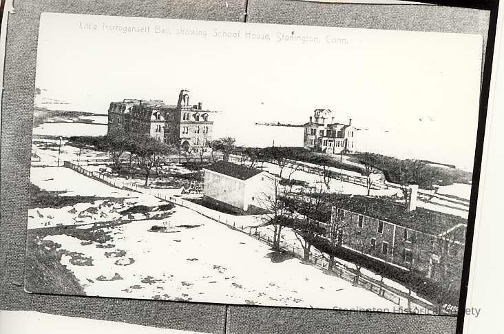 Photo of postcard of Borough School and Eugene Atwood's house with Little Narragansett Bay in background