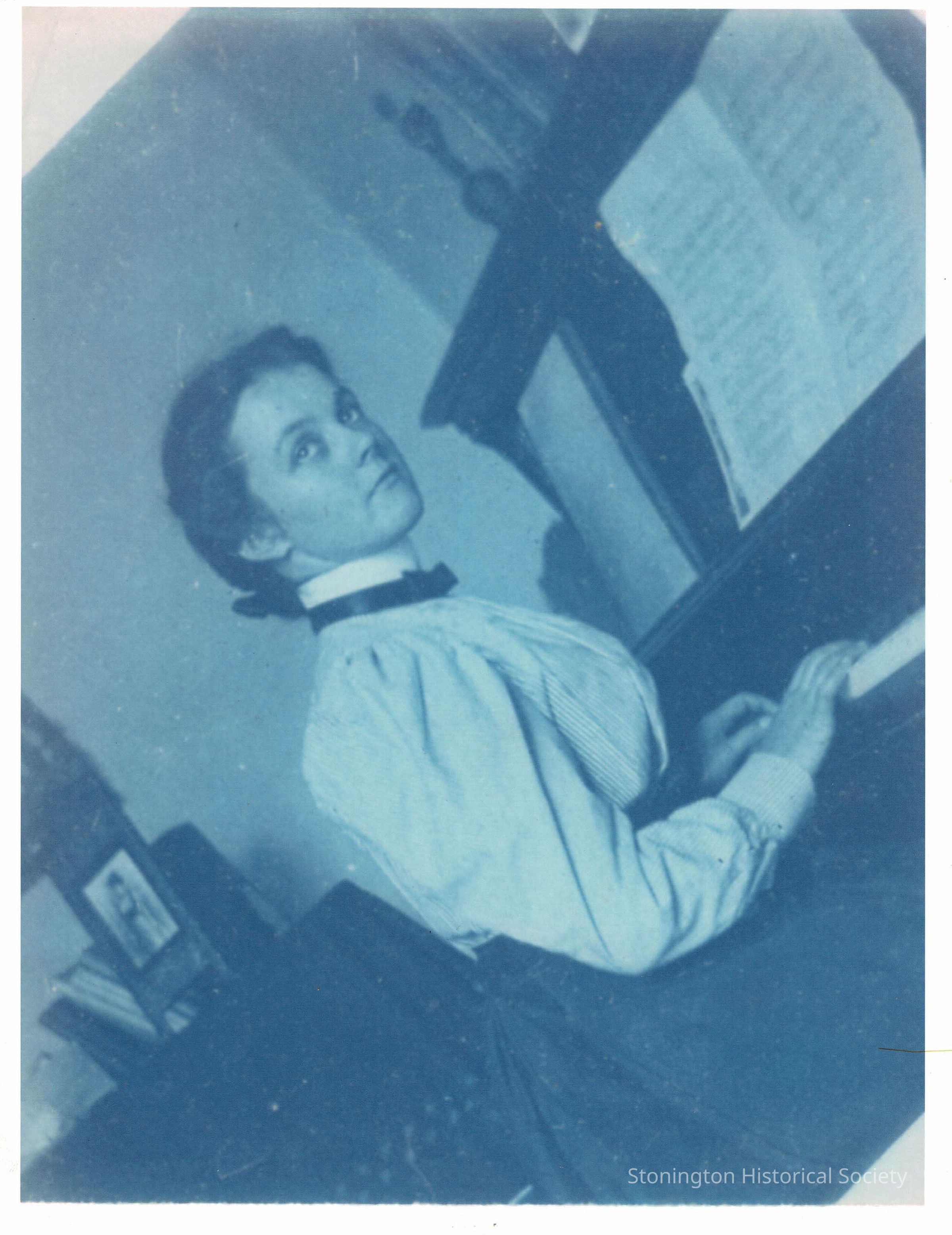 3.5" square cyanotype photograph (blue) of Priscilla Loper, dressed in "Gibson Girl" style shirtwaist with leg of mutton sleeves, sitting at the piano and looking at the photographer (Alex Loper?).