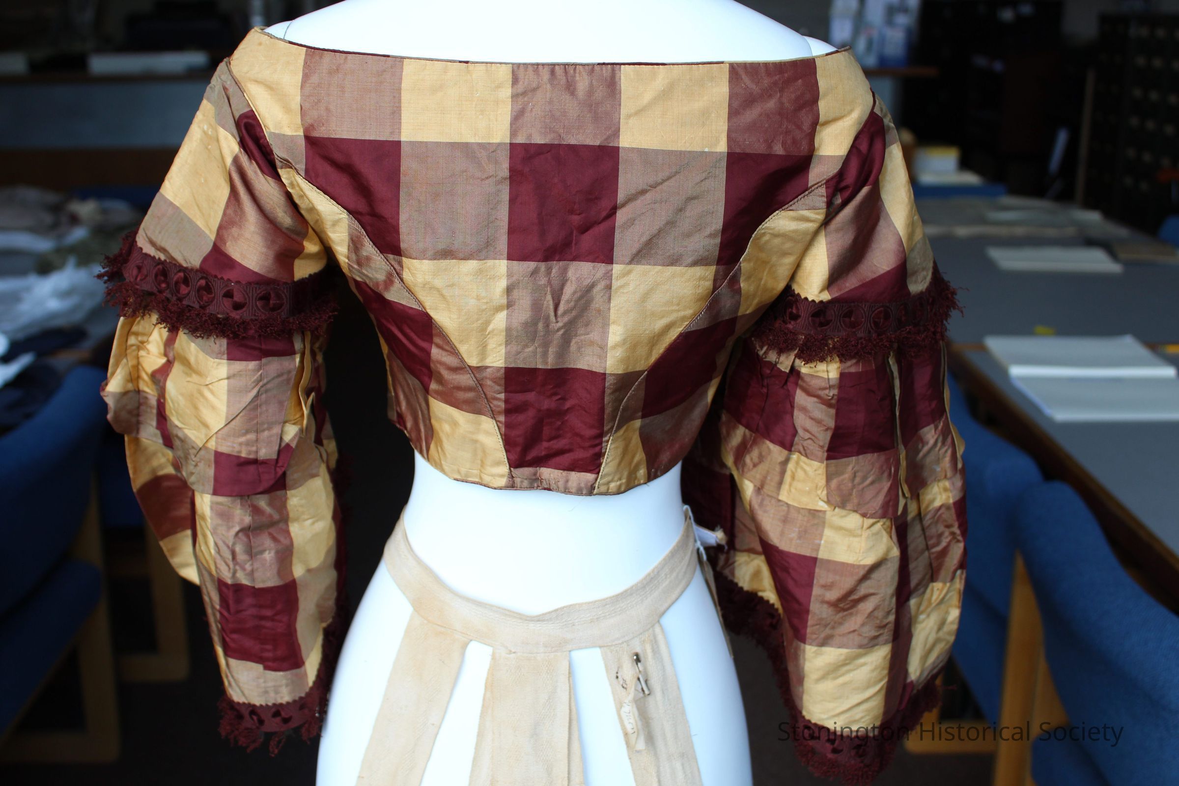 a- silk plaid high waistline boatneck bodice with pagoda sleeves with cap oversleeve