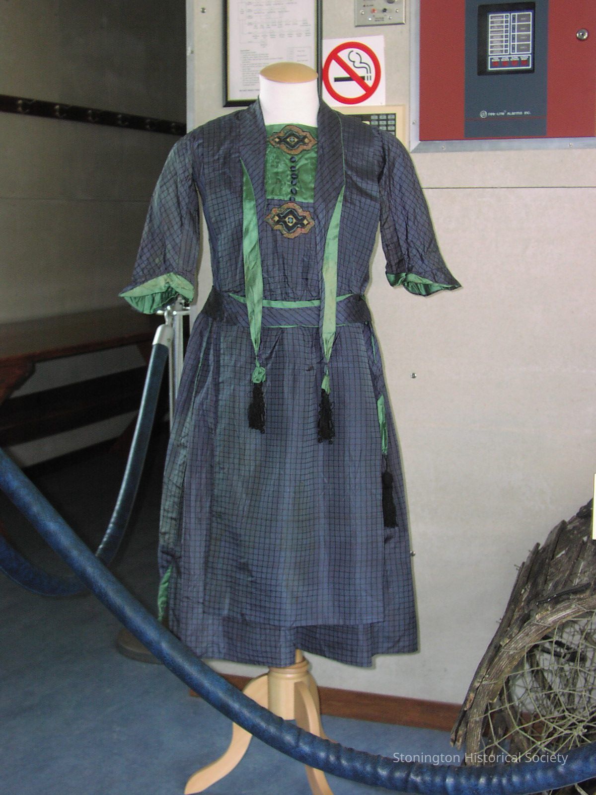 Green silk satin contrast lining on shawl, collar,belt,ties and cuffs