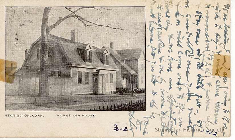 "Thomas Ash house corner Ash and Main Sts. Katherine Mason Ford resided here for some time, purchased from Mrs. Scholfield, presenetly owned by Raphael Avellar"