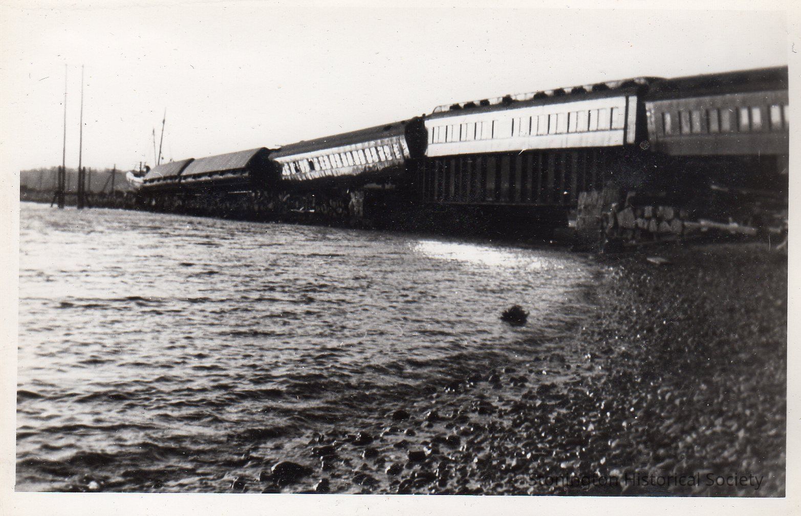 Black and white photograph of the train derailment outside of Stonington Borough following the 1938 Hurricane. From photograph album of Bertha D'Amico.