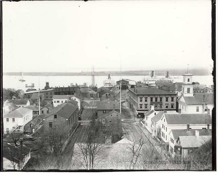 Aerial view of harbor facing west from Congregational Church tower showing rail tracks and ships at docks; First Baptist Church on right (Water Street behind Pearl Street) and Potter Block (corner of Water and Pearl Streets) visible