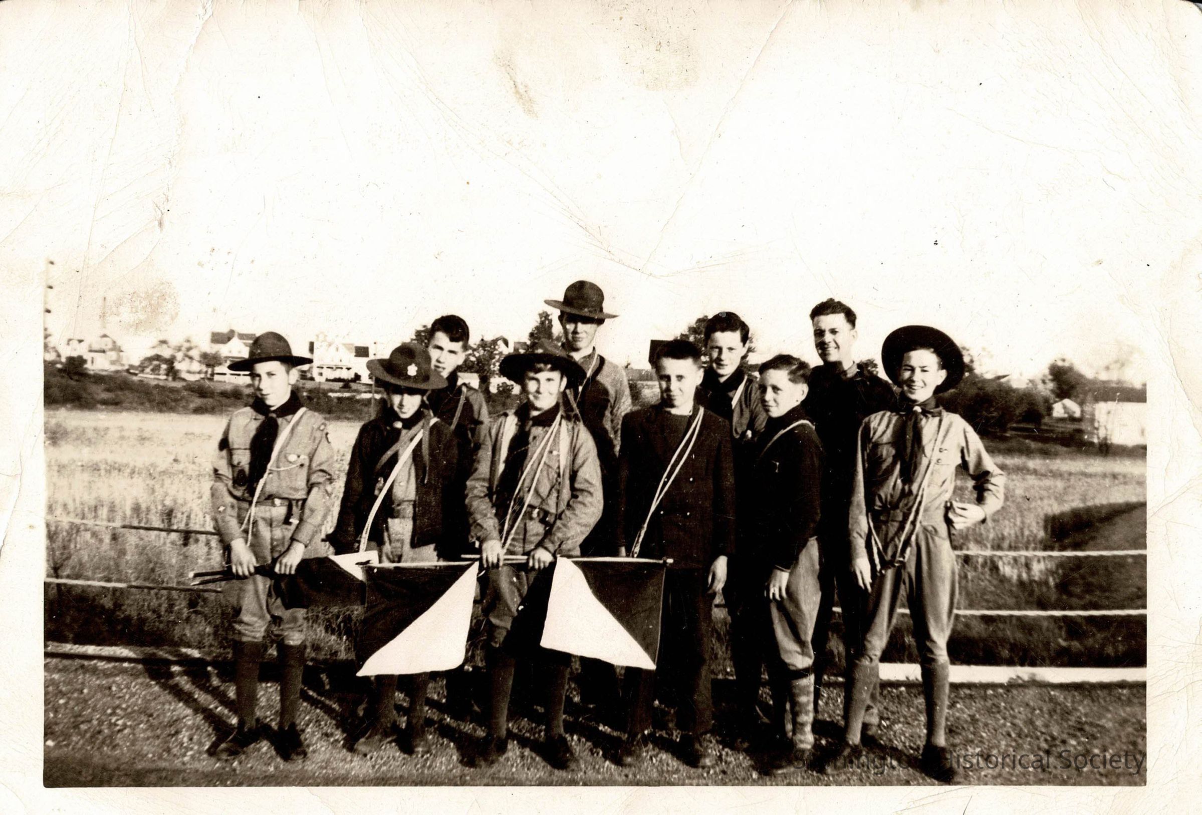 Black and white photograph of Stonington Boy Scout Troop 18. Stamp on back of the photograph reads 1941, but may not be accurate. Andy Perry (1927-2014) is standing at the front center, holding two signal flags.Collection