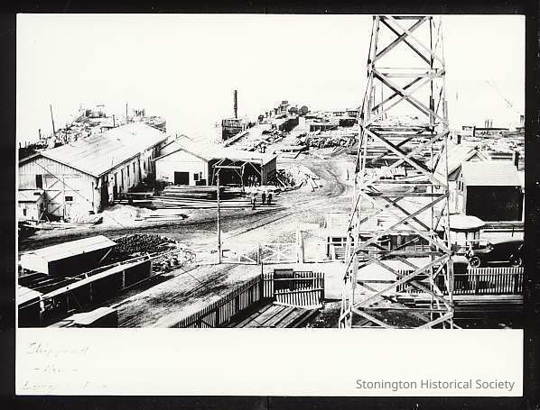 View of rail yard at eastern end of Pearl Street, Stonington showing tower on right
