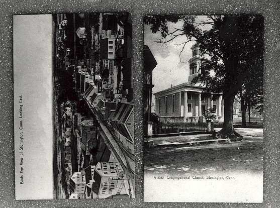 Photo of two Stonington postcards; one a birds eyeview to the east, other of Congregational Church